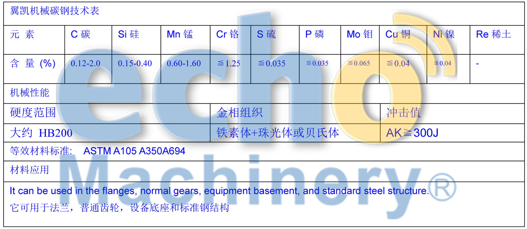 碳鋼是0.12-2.0%碳含量范圍內的鋼。隨著含碳量的增加,鋼可以通過熱處理變得更硬更強。然而,它的延展性變差了。無論熱處理如何,較高的碳含量都會降低可焊性。在碳鋼中,含碳量越高,熔點越低。 翼凱機械是您工廠所有設備所需的配件商店。翼凱機械提供的所有配件都有ISO 9001認證,只有通過我們的質量控制程序后才能發貨。翼凱機械的銷售團隊隨時準備幫助您報價并檢查庫存。我們的工程師愿意回答你的技術問題。現在就和翼凱機械談談你的具體需求吧!